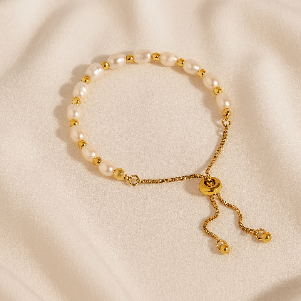 With glistening gold-tone beads and real freshwater pearls, this bracelet brings effortless elegance to your everyday stack. Made from adjustable, tarnish-free stainless steel (no green skin here!), she’s waterproof, lightweight, and made for long days, spontaneous swims, and late-night dinners.