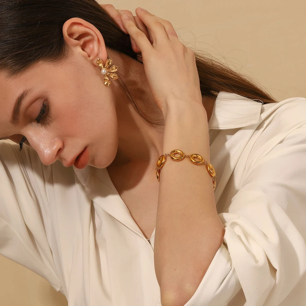 The Vera Circle Bracelet is minimalism refined — polished loops linked in harmony, glowing with 18K gold plating. Crafted from 316L stainless steel, it’s waterproof, tarnish-free, and hypoallergenic, designed to keep its true shine through every wear.
